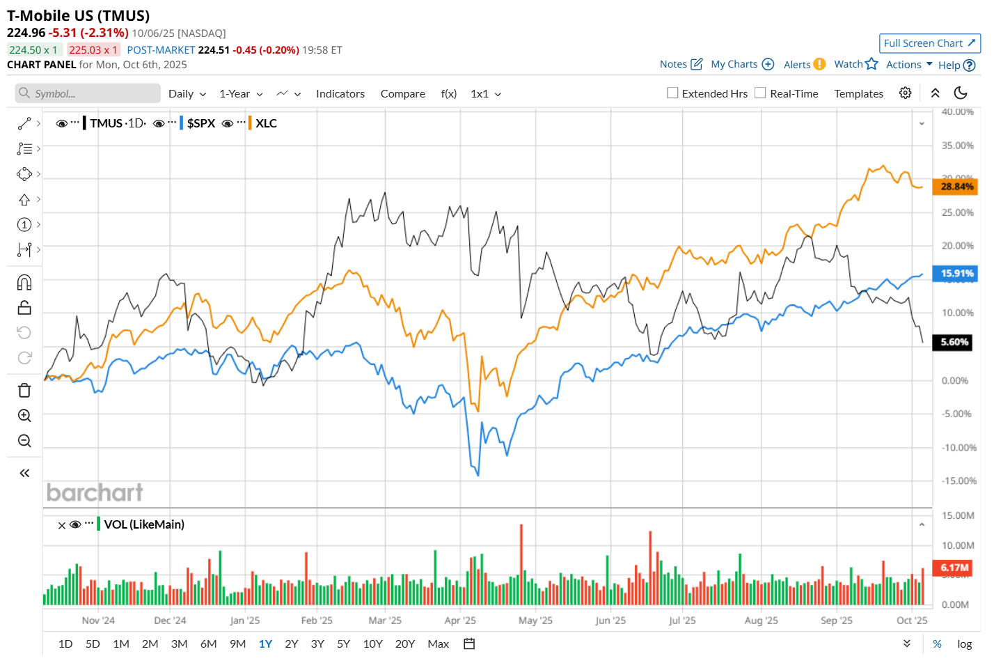 TMUS has gained 8% over the past 52 weeks, lagging behind both the S&P 500 Index's ($SPX) 17.2% return and the Communication Services Select Sector SPDR Fund’s (XLC) 28.2% rise over the same time frame.