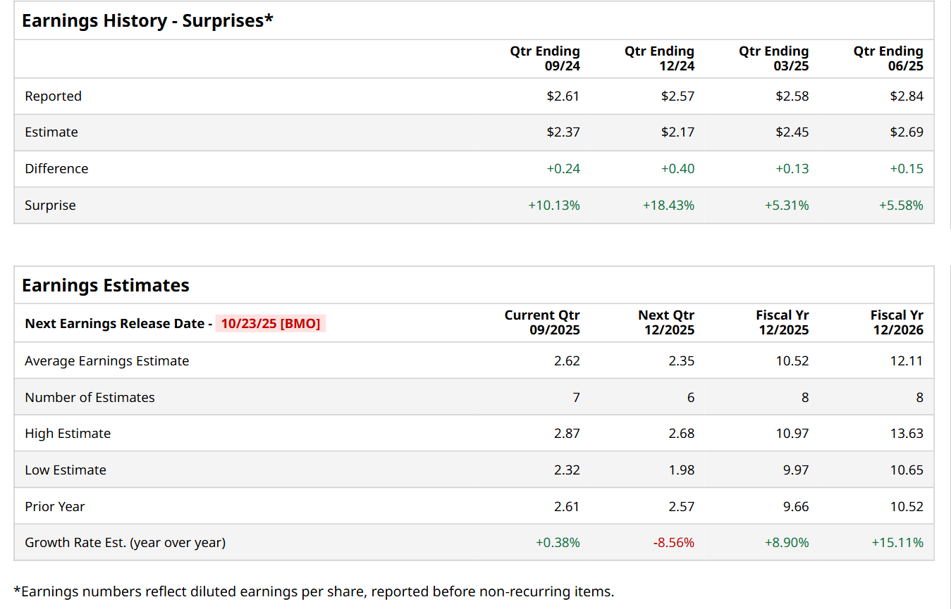 Bellevue, Washington-based T-Mobile US, Inc. (TMUS) is a wireless communications services company that provides voice, messaging, and data services across postpaid, prepaid, and wholesale channels. Valued at a market cap of $253.2 billion, the company is expected to announce its fiscal Q3 earnings for 2025 before the market opens on Thursday, Oct. 23.