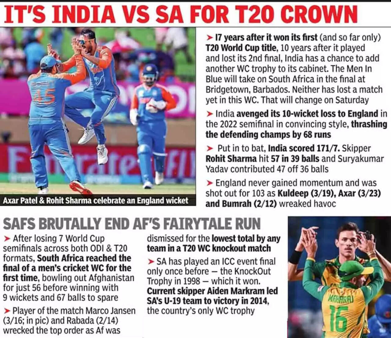 Rohit's 39-ball 57, Surya's 47 and spinners Axar and Kuldeep's triple strikes fashion crushing 68-run win over England in semifinal; Men in Blue take on SA in final
