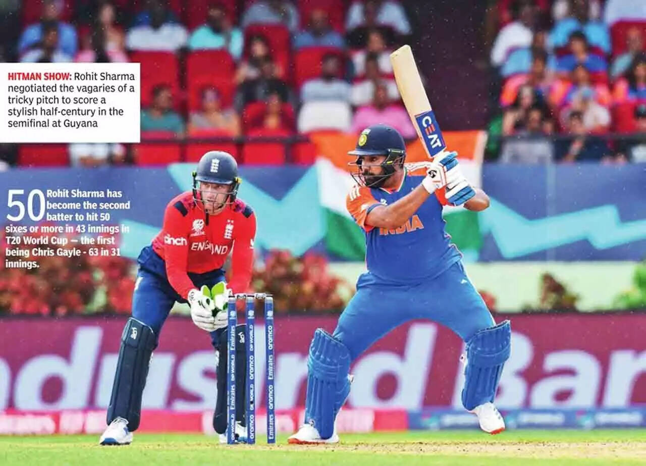 The skipper knows this will probably be his last chance to win a limited-overs ICC trophy --both as a captain and as a player. There's been an element of determination in every step that he has taken so far, and it wasn't any different on Thursday. Rohit showed during the course of his 57 off 39 balls his incredible ability to alter his style, and yet be effective. He knew that the game that he played in St. Lucia against Australia wasn't possible on this pitch, so he didn't try to throw his hands at every ball. Here he played the waiting game and the odd loose ball was dealt with.