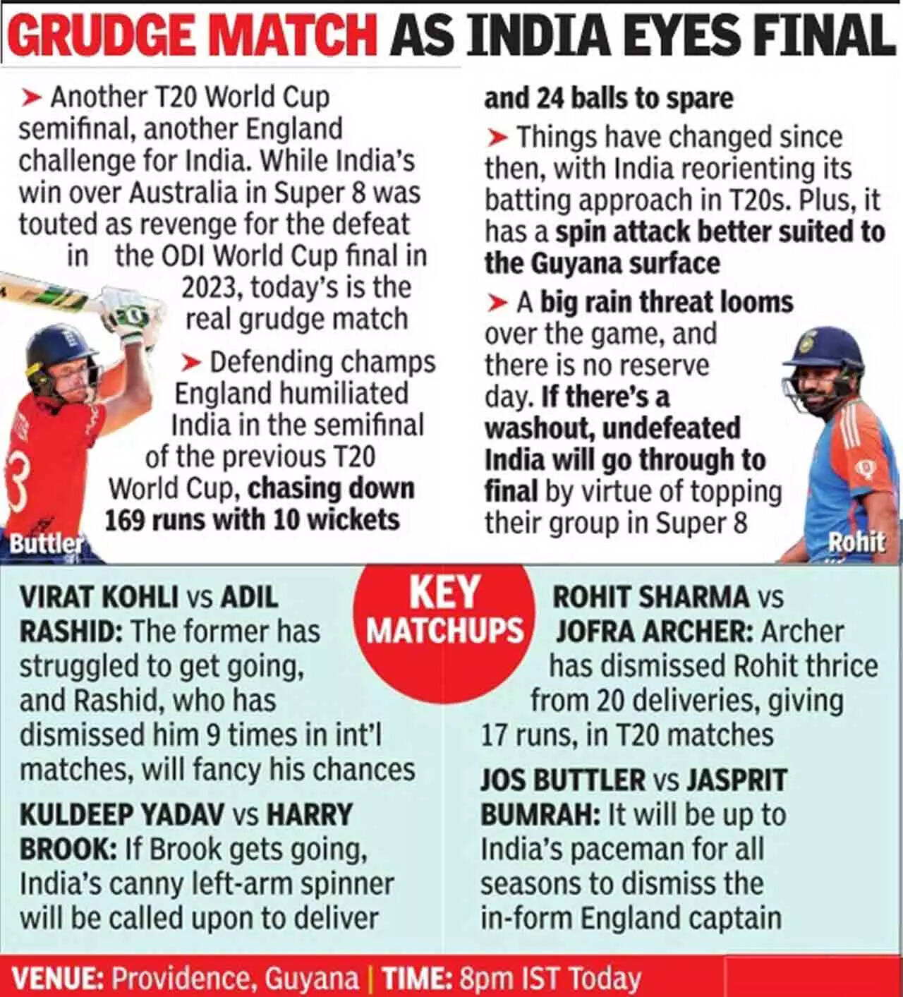 India will seek to avenge defeat at England's hands in the 2022 WC semis, but rain looms and while a washout will see Rohit's men through, a truncated game could get tricky...