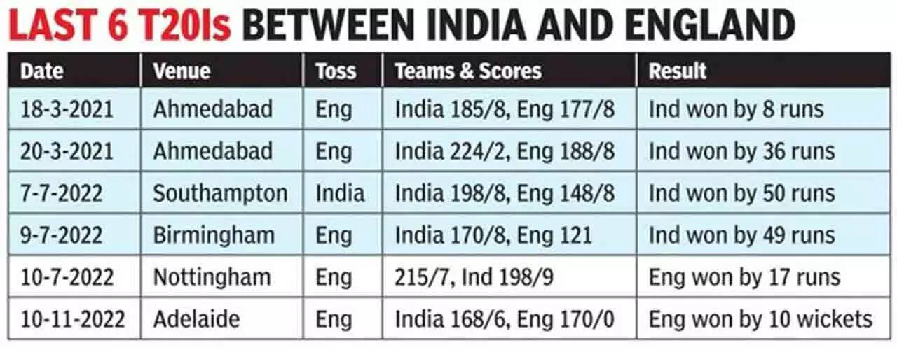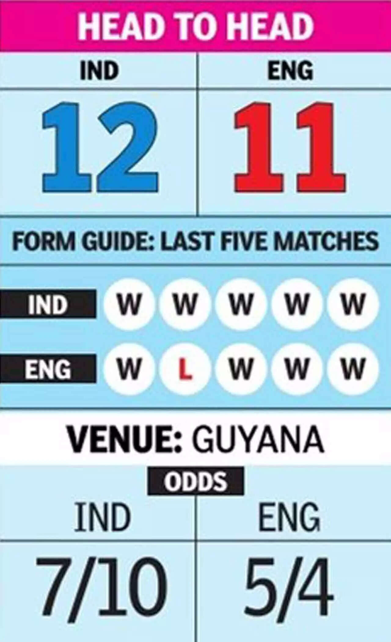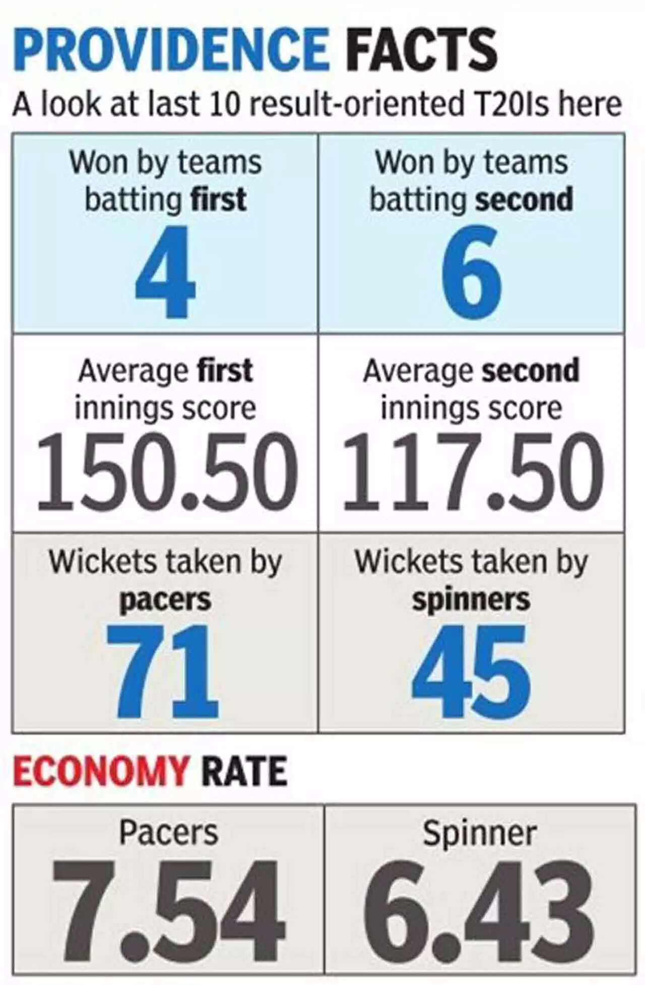 BRACE FOR SPIN: Providence Stadium is a spinner's haven with low, sharp turn on offer. Spinners have conceded less than 7 runs per over here in recent times, good news for India's spin troika - Kuldeep, Axar and Jadeja. England too boast of Moeen Ali, Adil Rashid and Liam Livingstone in their ranks for this day game.