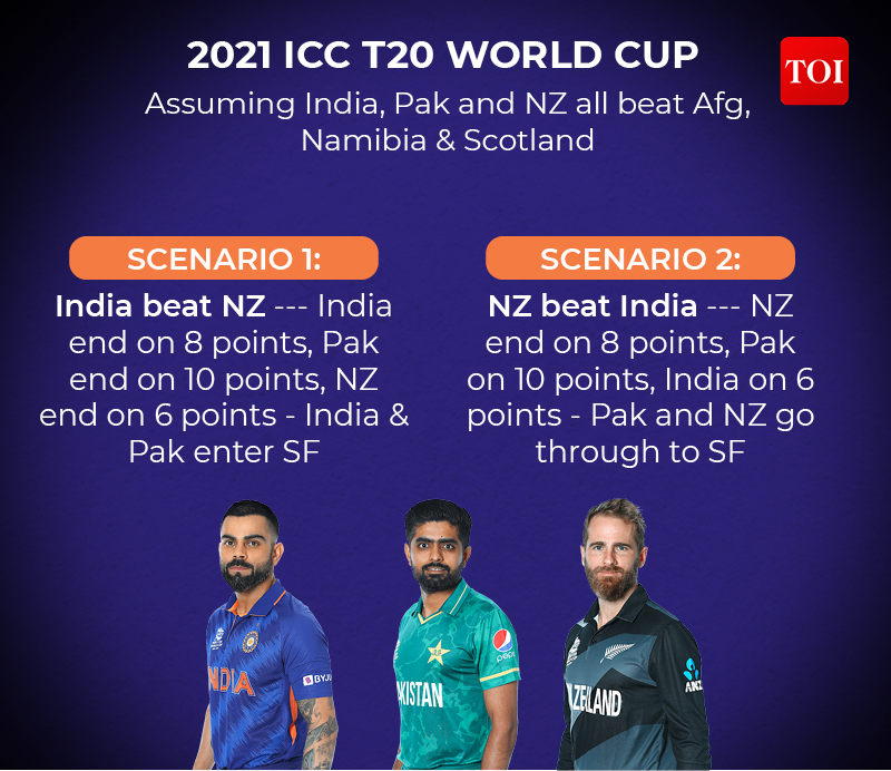 Taking the hypothesis that Pakistan, India and NZ will all beat Afghanistan, Namibia and Scotland, the team winning the India vs NZ clash will be the one joining Pakistan in the semi-finals.