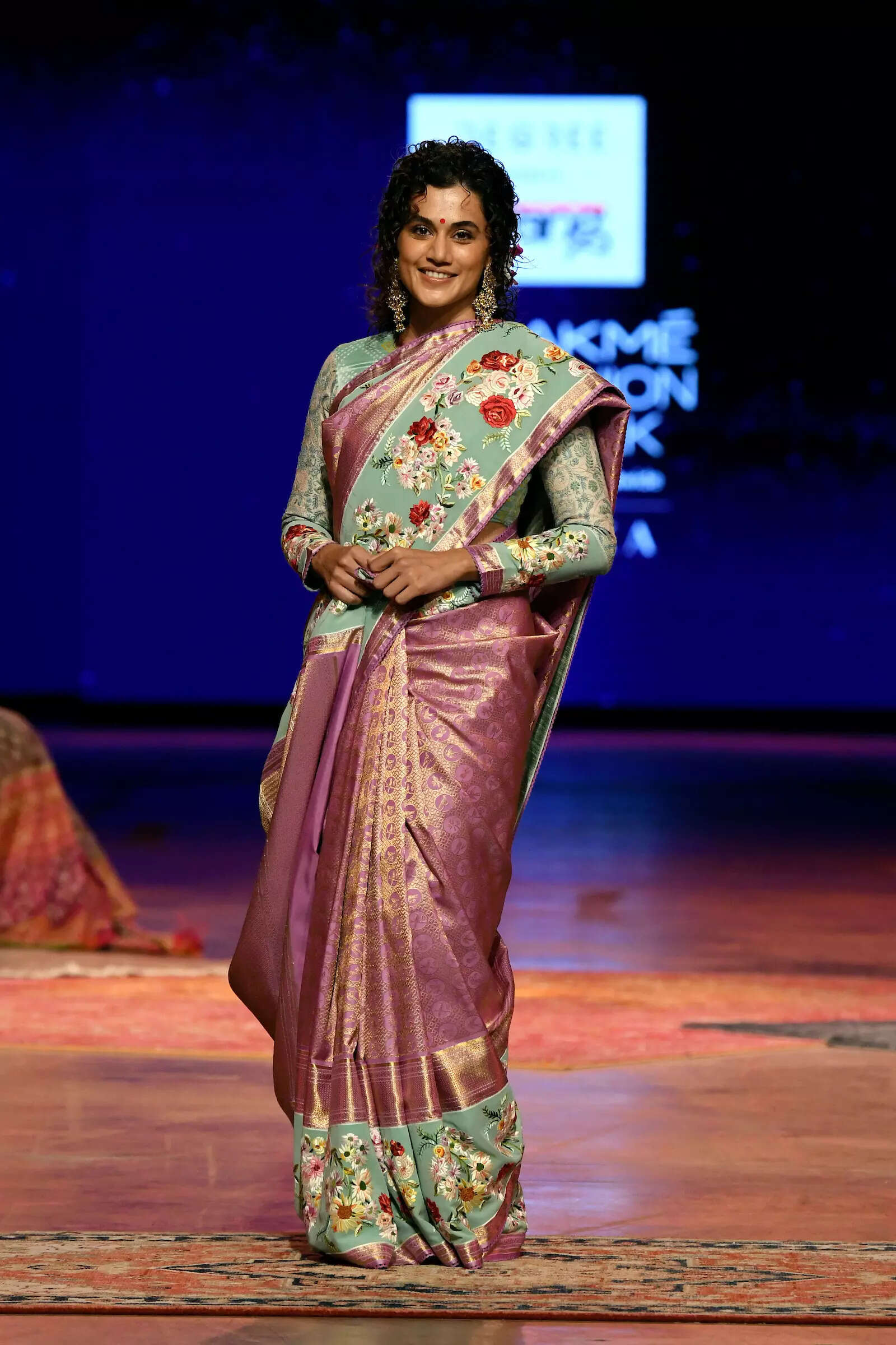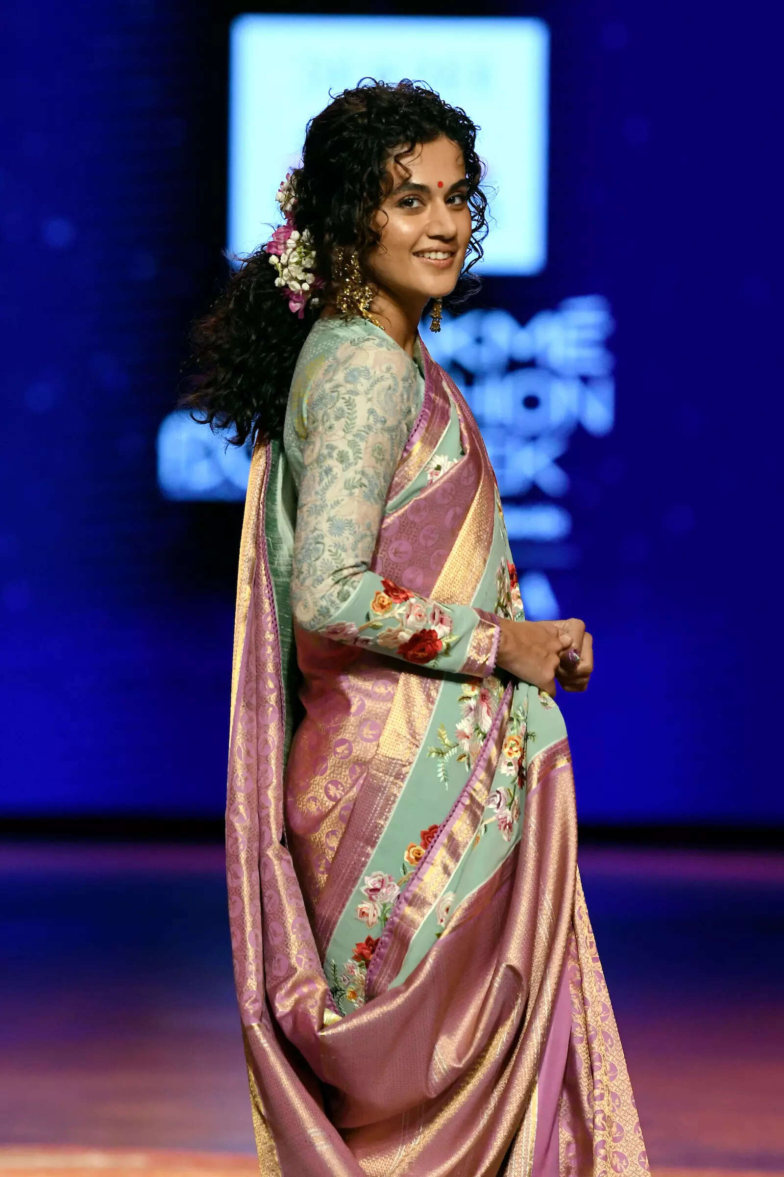 Taapsee Pannu looked ethereal as she walked for designer Gaurang Shah at the ongoing FDCI x Lakme Fashion Week. The designer unveiled his exquisite sari collection titled Chaand. Taapsee Pannu looked stunning in a gorgeous weave with a wide floral border.