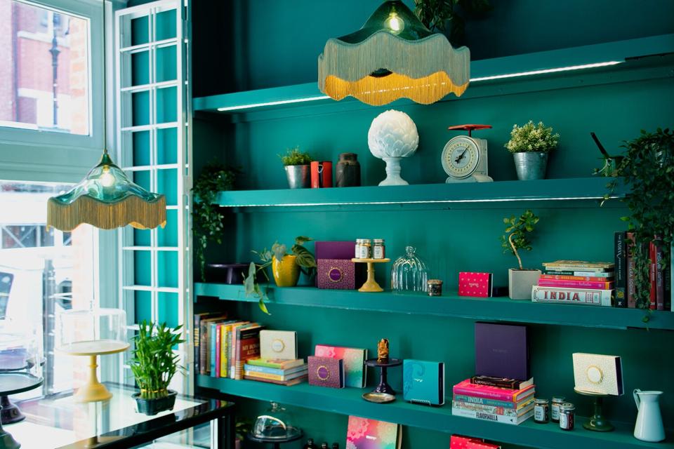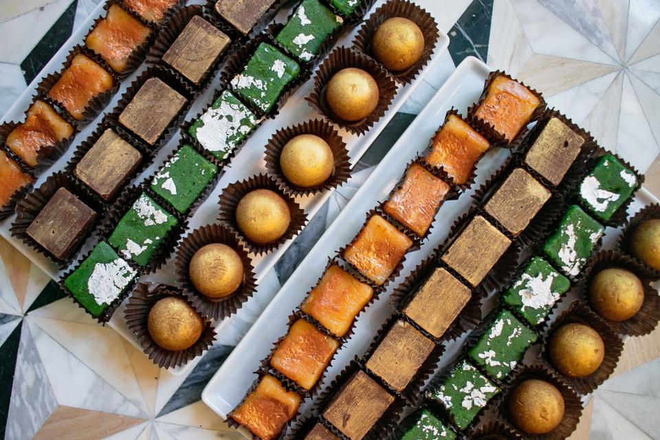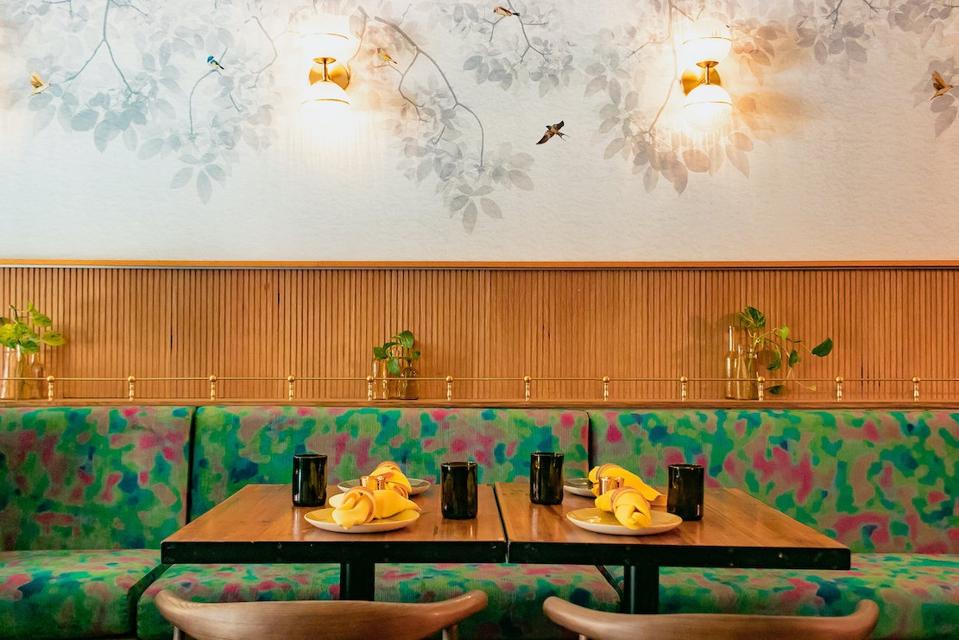 In the front are her beautifully packaged candies and pastries; up a couple of red brick steps is a well-lighted, brilliantly colorful dining room with a velvet watercolor stained banquette, Persian black and white tiled floor, sea-blue glass light fixtures with gold tassels and a gold-flecked Patagonia stone bar. The walls are half slatted wood, which matches the color of the polished tables, and the wall painted with foliage and birds. The table is set with rustic china and ceramics and folded yellow napkins.