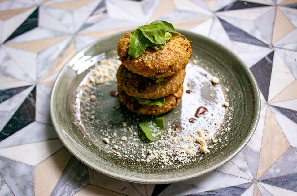 Everything at Tagmo is meant to be shared, which is a good part of the fun, with no dish over $27, and there is a helpful dietary key: “gf = gluten free · v = vegan · veg = vegetarian; spice levels low = no heat · mild = little heat · med = medium heat · spicy = very hot.” When it comes to Indian food, heat is not as much a driving factor as balance, some of which is based on religious tradition, all based on healthfulness. The menu is plant-driven, though not entirely, so you may begin with veggie plates like khatta meetha chaat ($15), which is a Delhi-style salad of peas, mangoes, cucumbers, crispy potatoes and well-named “devil’s chutney.” The bread roll plate ($15) is not just a basket of bread, but deep fried rolls stuffed with paneer cottage cheese, green chilies, onions, cilantro and tomato chili sauce, which is wonderful as a starter not least because it is quite mild but full of spices. Sabudana vada ($17) is a Maharashtrian dish of tapioca cakes with potatoes, roasted peanuts, curry leaves, green chilies, mint and a rich peanut yogurt chutney, which really shows off the delicacy of intertwined seasonings where none overpowers the others.