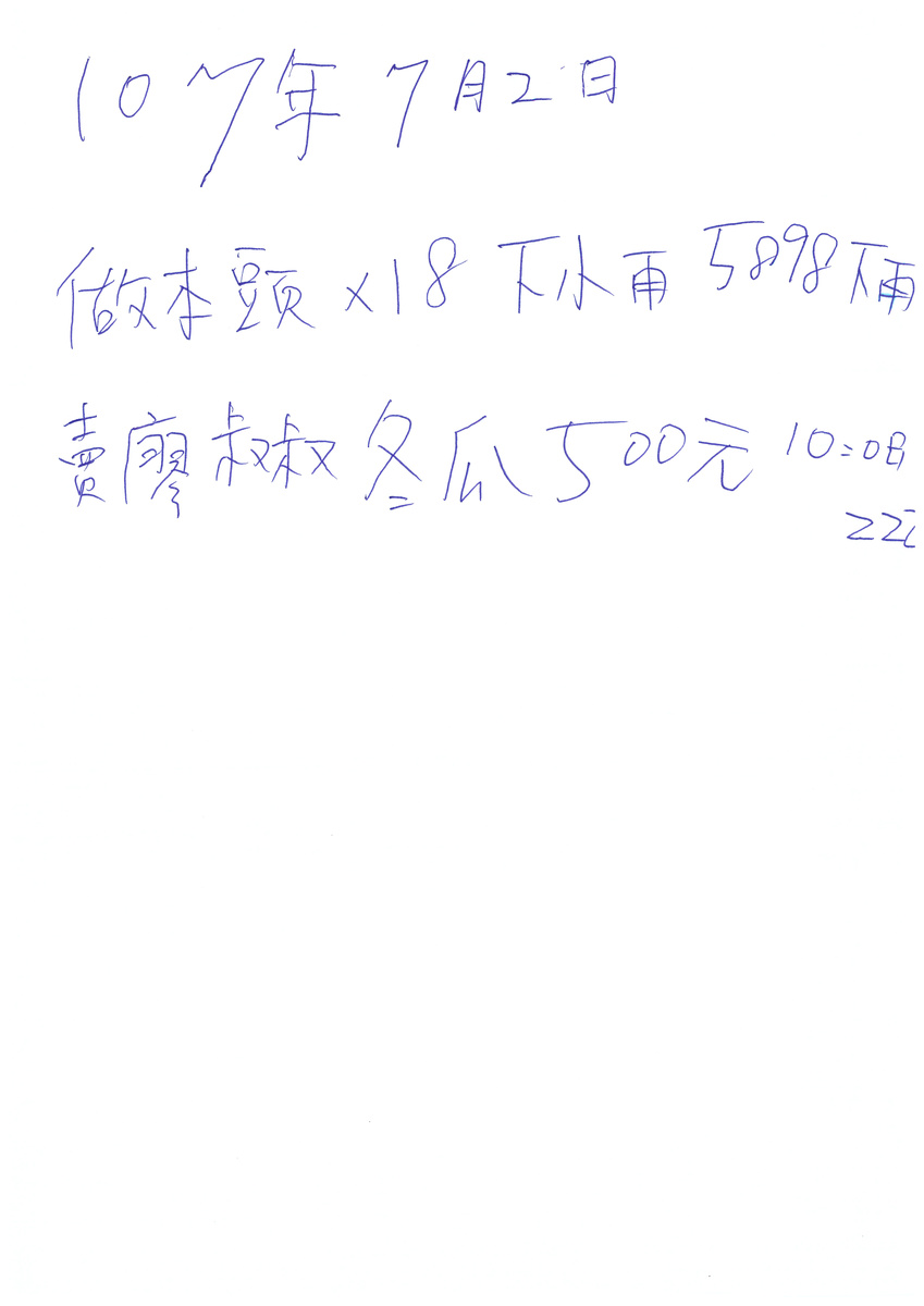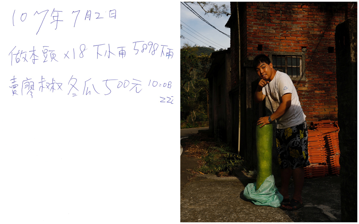 A combination picture shows a scanned copy of a note written by Chen Hong-zhi, 26, who suffers from short-term memory loss, detailing his day on July 2, where he writes, he chopped 18 bamboos for cooking, removed 5898 weeds on the rainy day, earned T$500 ($16.3) by helping Uncle Liao to sell wax gourds, and slept at 10:08pm (L), and Chen Hong-zhi holding a wax gourd for sale, outside his home, in Hsinchu, Taiwan, July 2, 2018. The note reads: "July 2, 2018 Make chopped bamboos a little rain 5898 rain sell uncle Liao wax gourds T$500 10:08 ZZZ". REUTERS/Tyrone Siu