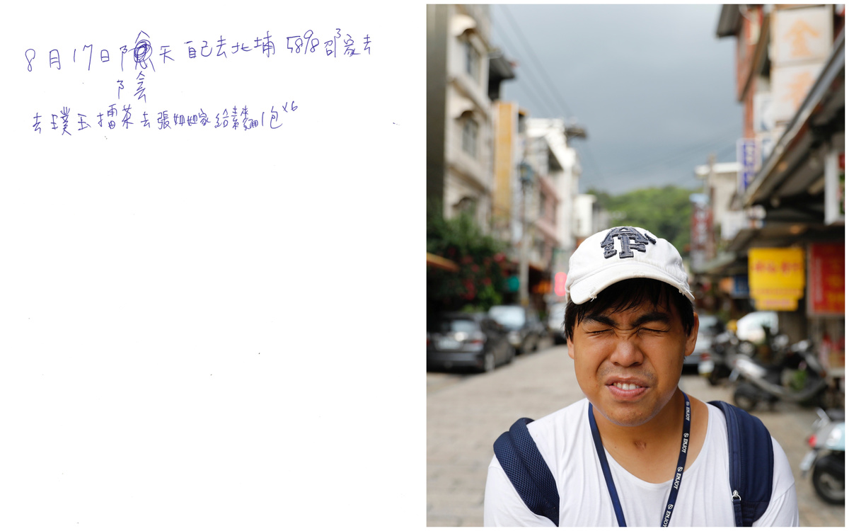 A combination picture shows a scanned copy of a note written by Chen Hong-zhi, 26, who suffers from short-term memory loss, detailing his day on August 17, where he writes, he removed 5898 weeds and went to Beipu Old Street area to buy ground tea and breads for his friend, Sister Jhang, (L) and Chen Hong-zhi walking in Beipu Old Street area in Hsinchu, Taiwan, August 17, 2018. The note reads: "August 17 overcast go to Beipu alone 5898 Shao's house go go ground tea go sister Jhang give bread 1 packet x6". REUTERS/Tyrone Siu