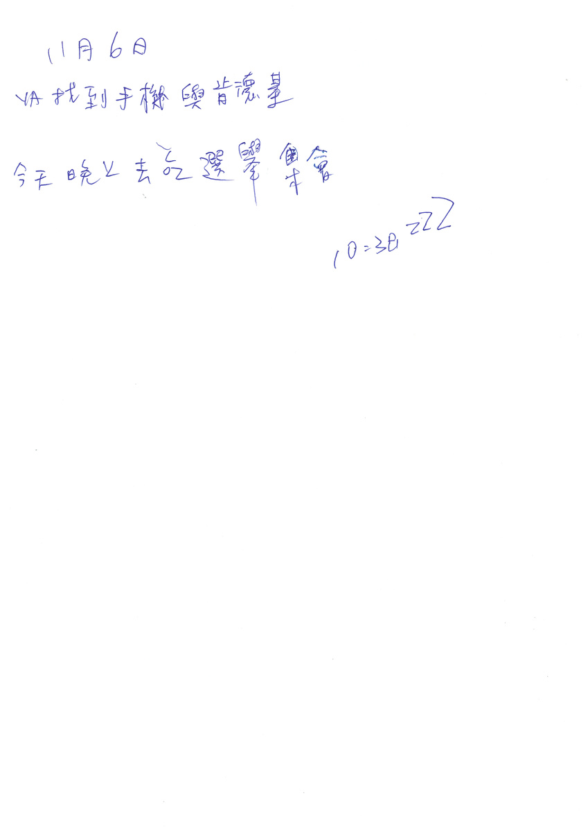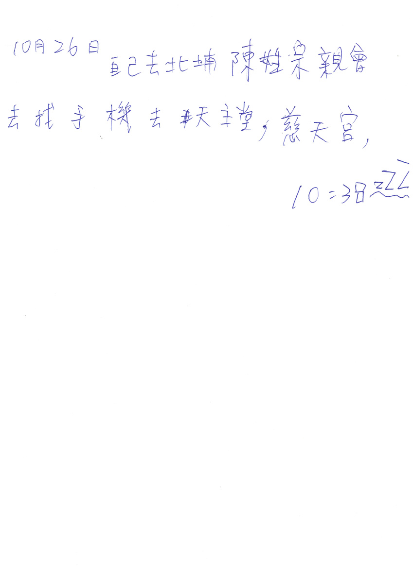 "October 26 go to Beipu alone, Chen clan organization, go find phone, go Catholic church, Citian Temple, 10:38 ZZZ", reads one poignant note about a day he spent searching for, and praying to find, his lost mobile phone.