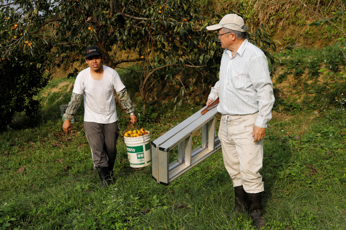 A combination picture shows a scanned copy of a note written by Chen Hong-zhi, 26, who suffers from short-term memory loss, detailing his day on November 7, where he writes, he purchased daily necessities for his stepmother, removed 1998 weeds, visited his friend, Sister Jhang, helped his neighbour, Uncle Shao and slept at 10:28pm (L), and Chen Hong-zhi carrying persimmons collected from Shao's garden, in Hsinchu, Taiwan, November 7, 2018. The note reads: "November 7 10:28 ZZZ help mother buy stuff 1998 morning go sister Jhang's home help uncle Shao". REUTERS/Tyrone Siu