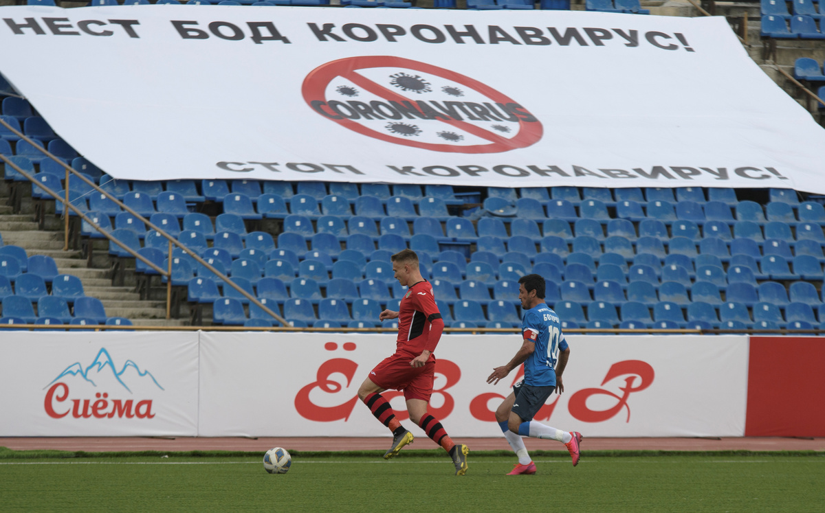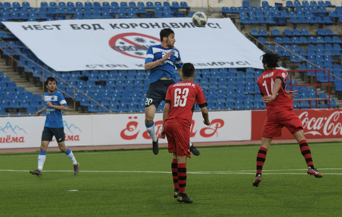 Soccer Football - Super Cup - FC Istiklol Dushanbe v FC Khujand - Dushanbe, Tajikistan April 4, 2020. Players fight for the ball during the match, as soccer competitions in Tajikistan continue despite the global coronavirus (COVID-19) outbreak. REUTERS/Nozim KalandarovSoccer Football - Super Cup - FC Istiklol Dushanbe v FC Khujand - Dushanbe, Tajikistan April 4, 2020. Players take part in the match, as soccer competitions in Tajikistan continue despite the global coronavirus (COVID-19) outbreak. The banner reads: "Stop coronavirus!" REUTERS/Nozim KalandarovSoccer Football - Super Cup - FC Istiklol Dushanbe v FC Khujand - Dushanbe, Tajikistan April 4, 2020. Players fight for the ball during the match, as soccer competitions in Tajikistan continue despite the global coronavirus (COVID-19) outbreak. REUTERS/Nozim KalandarovSoccer Football - Super Cup - FC Istiklol Dushanbe v FC Khujand - Dushanbe, Tajikistan April 4, 2020. Players greet each other before the match, as soccer competitions in Tajikistan continue despite the global coronavirus (COVID-19) outbreak. REUTERS/Nozim Kalandarov
