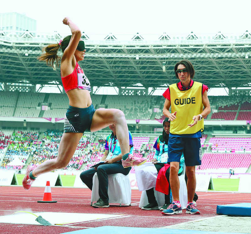 Chiaki Takada flies through the air during the long jump after coach Shigekazu Omori gives her the verbal cue to take off at the Asian Paralympic Games in 2018.