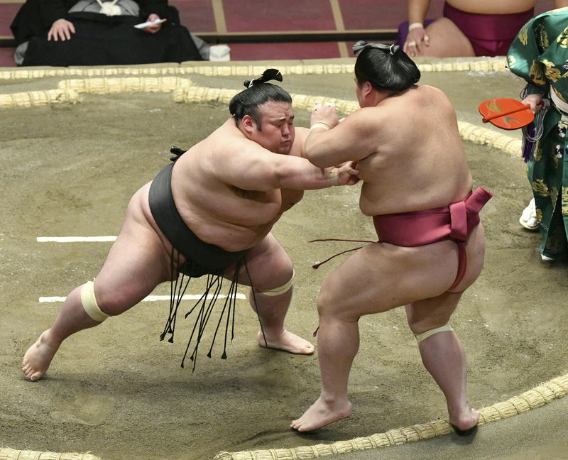 Daieisho, coming off his win over a hobbled Shodai on Wednesday, found the going tougher against a healthy Takakeisho, who used a merciless shoving attack to hand him his second loss.