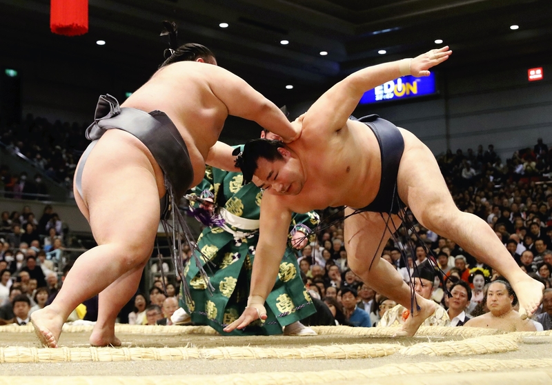 Fellow ozeki Takayasu suffered his second defeat at the hands of No. 4 maegashira Ichinojo, who improved to 9-1 by slapping down his opponent.