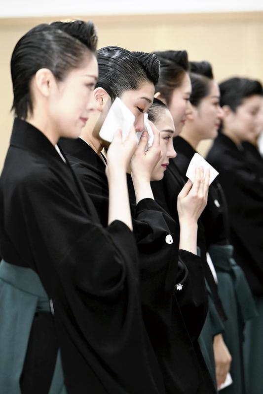 Principal Koichi Kobayashi applauded the graduates clad in traditional black crested montsuki kimono and green hakama trousers by saying, "Please continue your efforts to become a performer who gives people dreams and passion."
