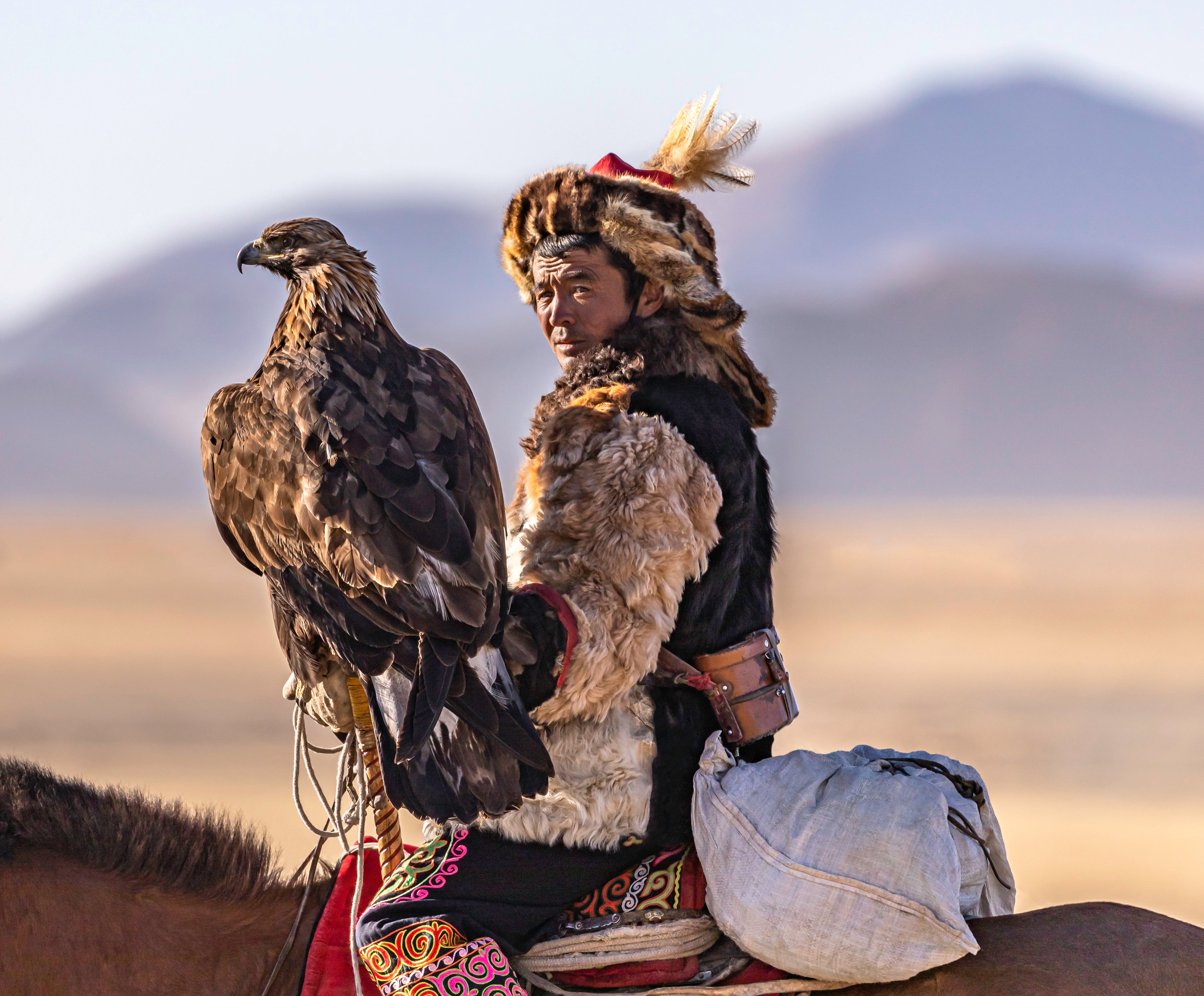 A portrait of a traditional Kazakh eagle hunter at the Eagle Festival in Western Mongolia. For generations, these horsemen have trained falcons to hunt hares, foxes and other small mammals.