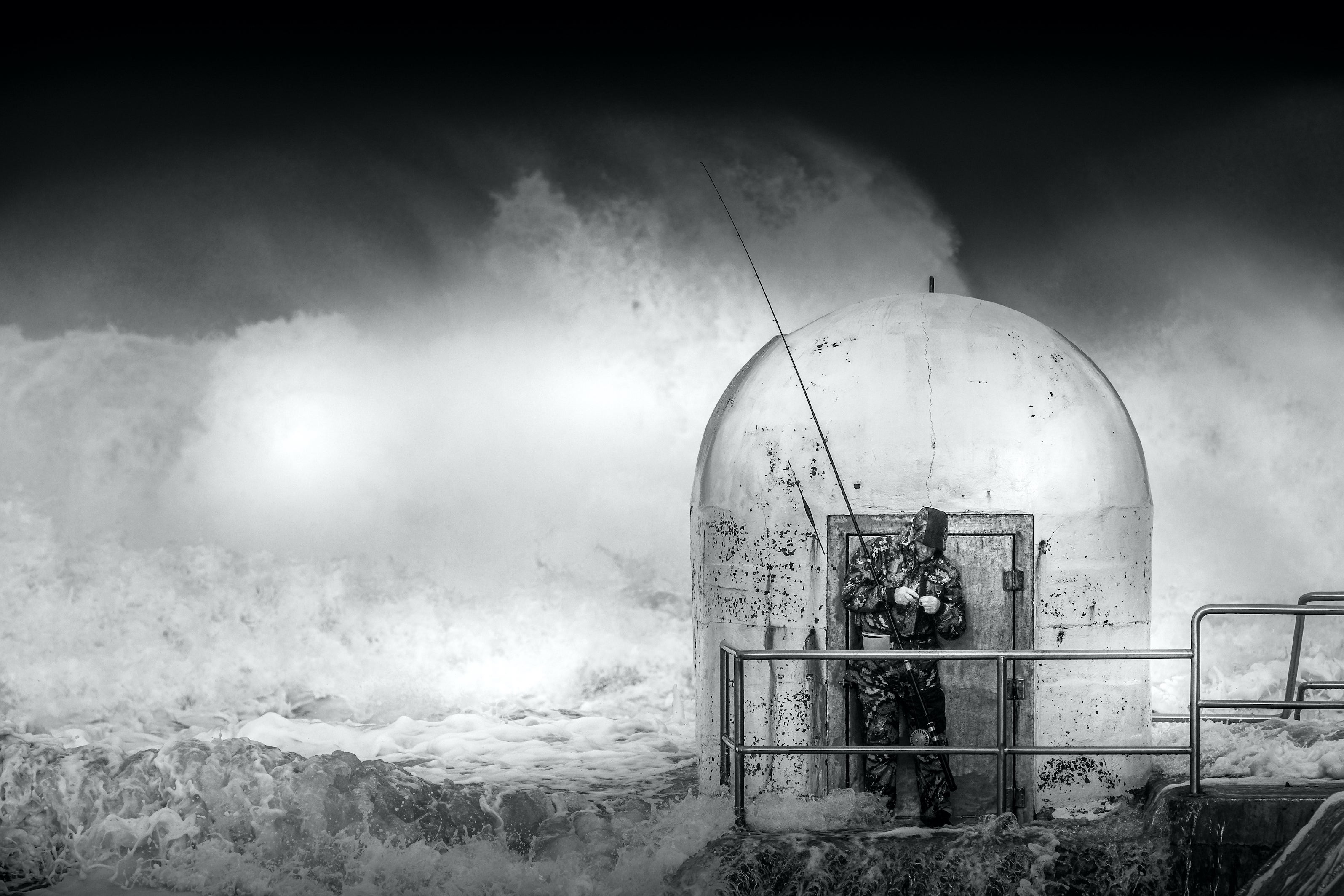 A fisherman struggles against the swell and his reel on a stormy day on the New South Wales coastline in Australia.