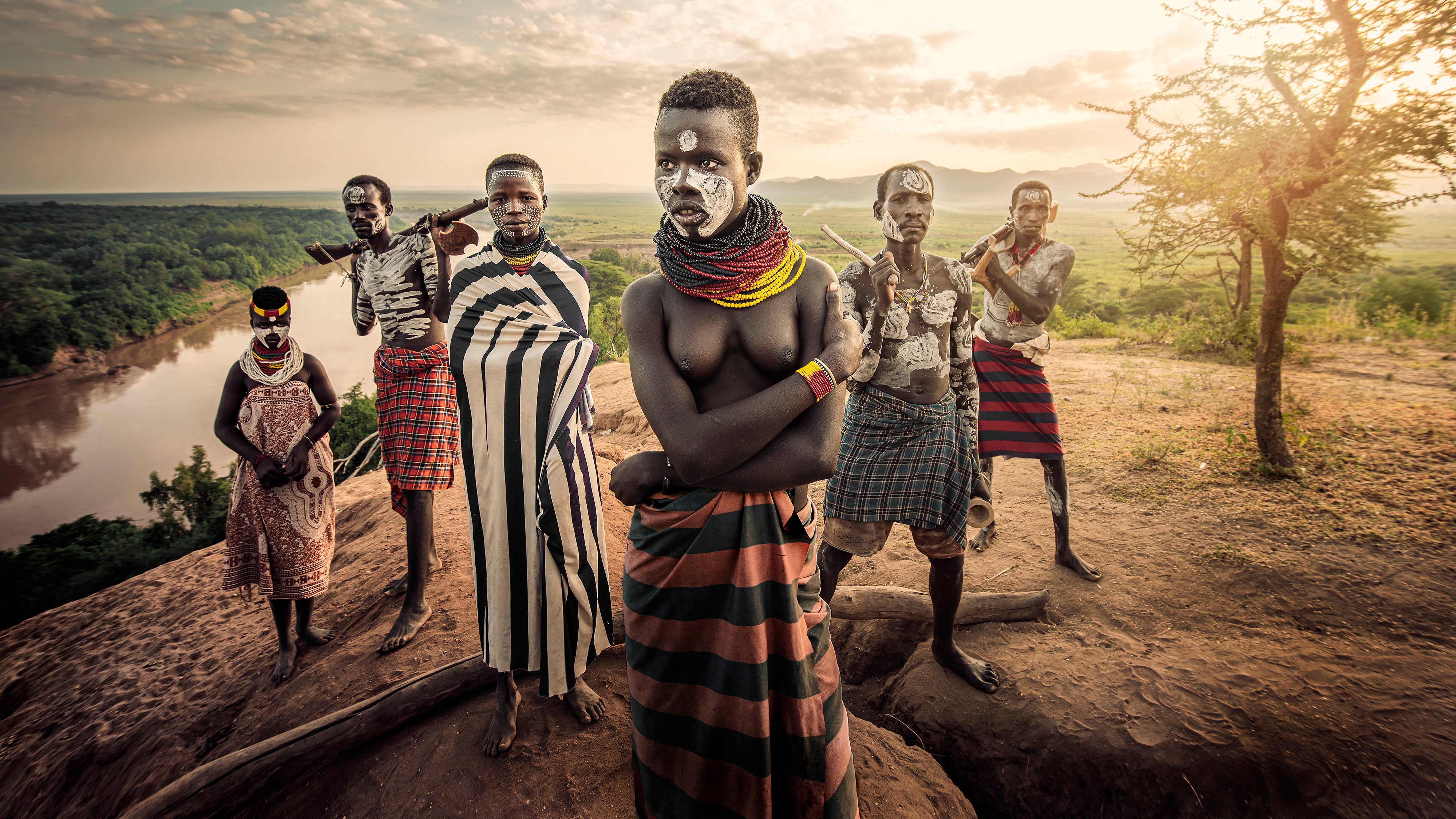 A portrait of a family of the Karo tribe, including father, mother, two brothers and two sisters. The tribe live along the Omo River in Ethiopia, and place a heavy emphasis on ornate body art and headdresses.