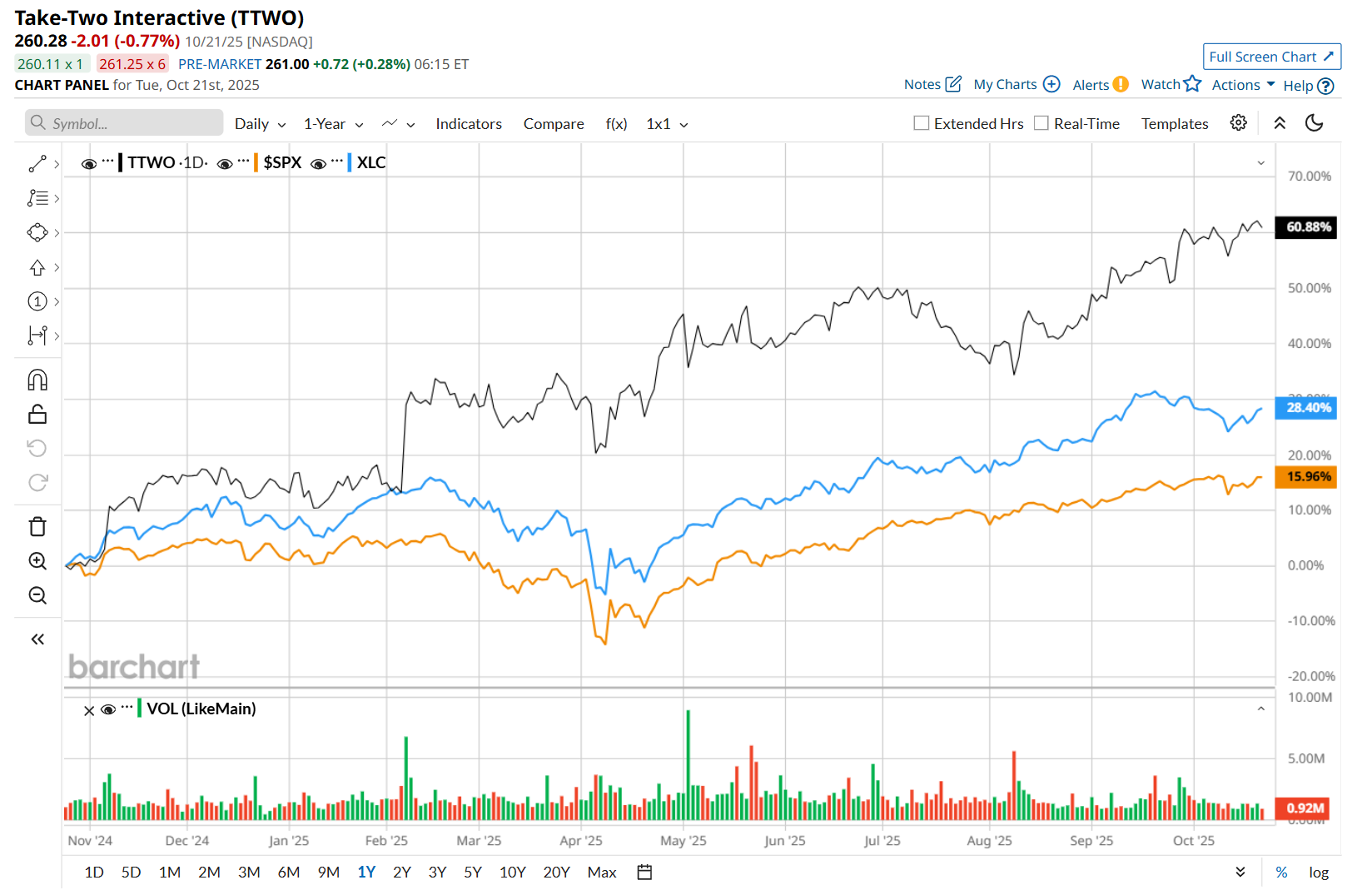 Shares of TTWO have rallied 65.9% over the past 52 weeks, significantly outperforming both the S&P 500 Index's ($SPX) 15.1% return and the Communication Services Select Sector SPDR Fund’s (XLC) 28.4% rise over the same time frame.