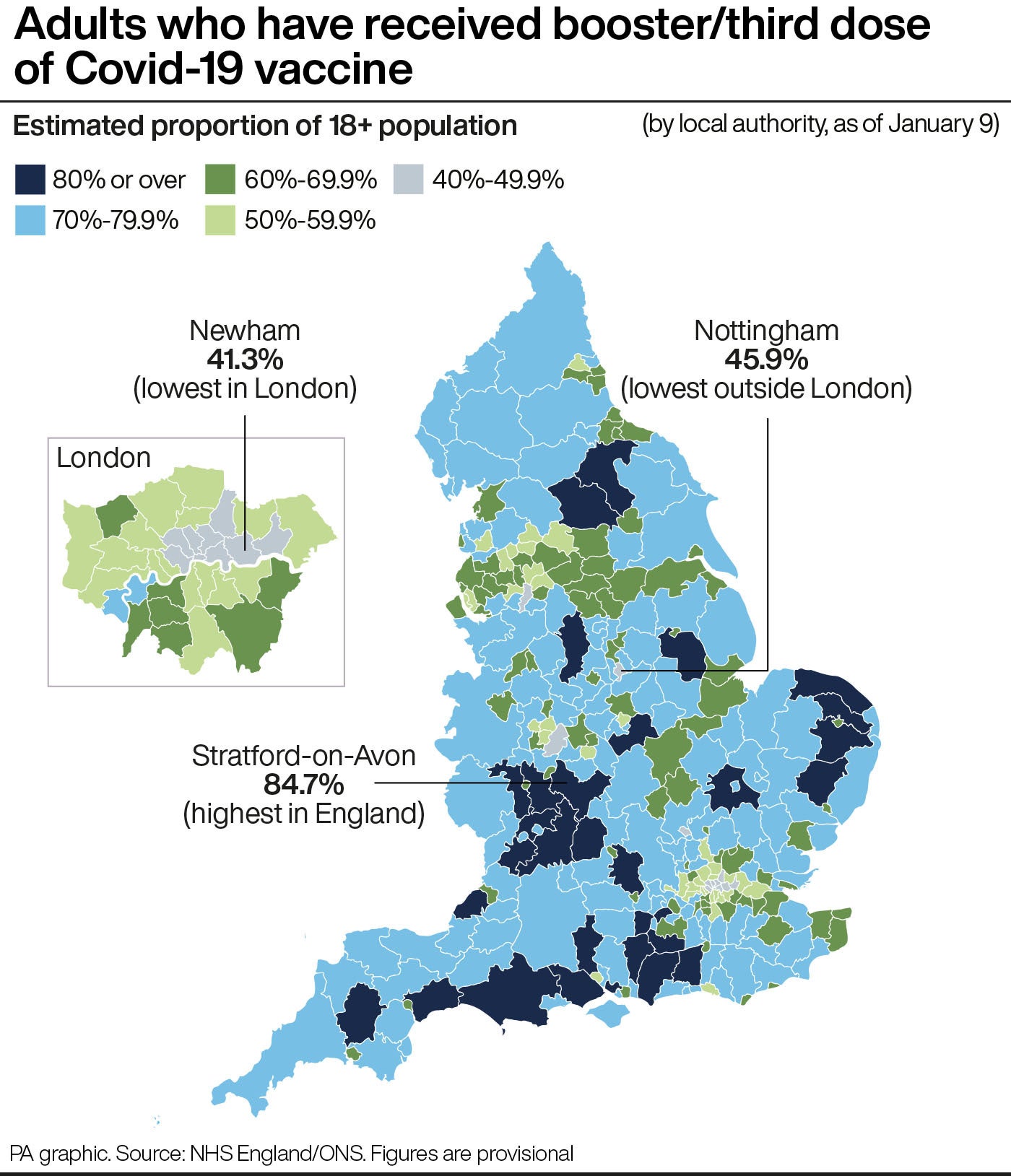 The figures have been compiled by the PA news agency using NHS England data for vaccinations up to January 9 2022 and population figures from the Office for National Statistics which are the best publicly available official estimates.