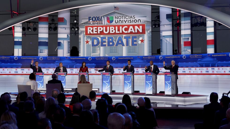 And no one — neither the three moderators nor the seven contenders, except for former New Jersey Gov. Chris Christie, who made a very brief mention — wanted to address the obvious: That frontrunner Trump has been charged in four criminal indictments, and that in a civil case in New York, a judge just found that businesses Trump and his eldest sons ran routinely committed fraud.