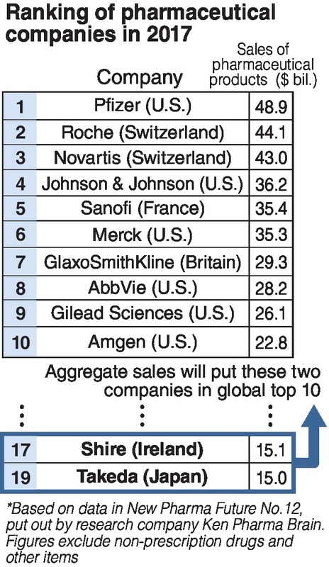 Since 2008, Takeda has made large acquisitions in the 1 trillion yen range, but it remains far behind the big drugmakers of Europe and the United States. According to market research firm Ken Pharma Brain, Takeda ranked 19th in the world in terms of medical product sales in 2017, less than one-third those of No. 1 Pfizer Inc. of the United States.