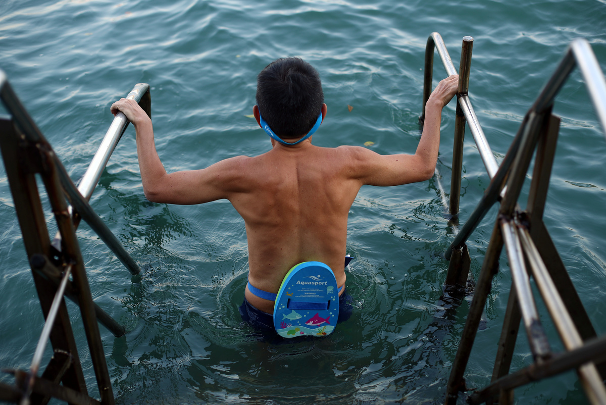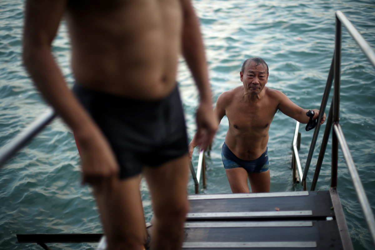 The residents, many of who have been swimming there for decades, plunge into the waters from steps reached by a spindly wooden bridge propped up on the rocks, just a stone's throw from the heart of the financial center against a busy backdrop of container ships, ferries and fishing boats.
