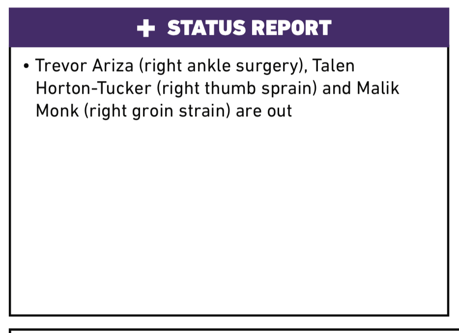 The Lakers list Talen Horton-Tucker (right thumb sprain) and Malik Monk (right groin strain) as out tomorrow against Phoenix. – 10:04 PM