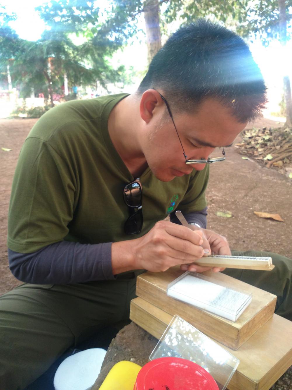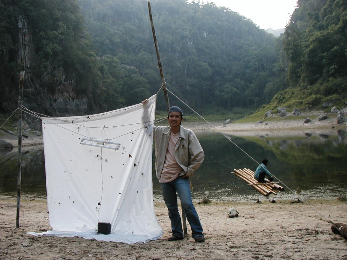 The work starts at night-time. I choose new-Moon nights. I go with my team sometimes. I also bring my students with me so they can have first-hand experience. When we find a site to camp on, we set up a moth trap, which consists of a sheet of white cloth (2m by 2m) and a mercury vapour lamp. Night insects will be attracted to the light and will land and form on the sheet set behind the light. We collect leafroller moths or other insects we want to study. We collect samples every three hours, from dusk till dawn. When we remove the sheet, other bugs will automatically fly away.