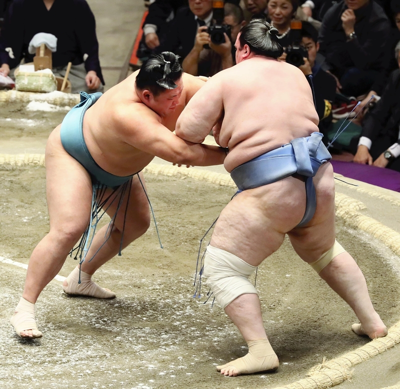 Sole leader Tamawashi pushed out No. 5 maegashira Aoiyama (7-7) to collect his 12th victory. Takakeisho also made quick work of his opponent, easily pushing out No. 4 maegashira Okinoumi (6-8) to pick up his 11th win.