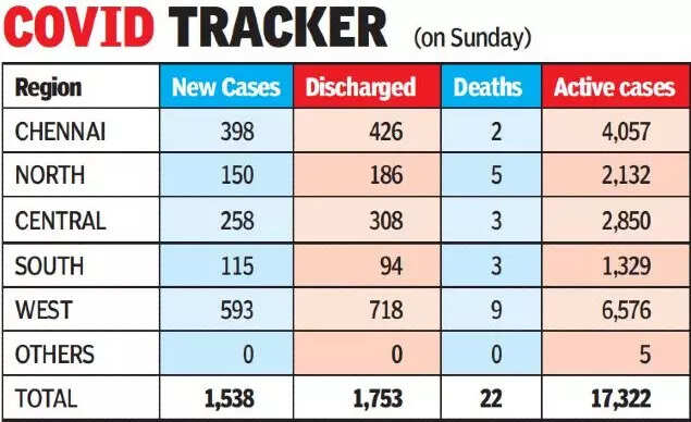 CHENNAI: The number of new Covid-19 cases in Tamil Nadu continued to decline with 1,538 fresh infections reported on Sunday. State health minister Ma Subramanian said 150 villages and tourist spots such as Tiruvannamalai, Velankanni, Nagoor and the Nilgiris will soon achieve 100% vaccination.
