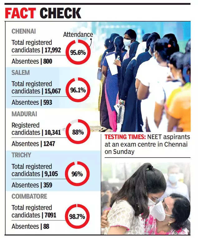 In Chennai, of 17,992 registered students, 800 were absent (attendance 96%). Likewise, Salem (96.1%), Trichy (96%) and Coimbatore