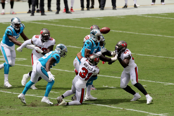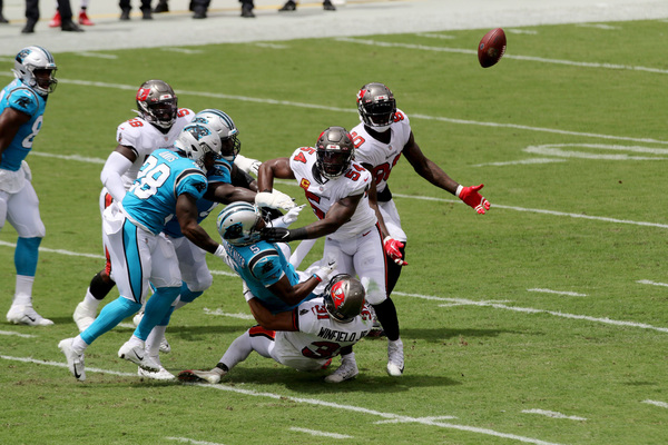 Carolina Panthers quarterback Teddy Bridgewater (5) fumbles the ball under pressure from Tampa Bay Buccaneers safety Antoine Winfield Jr. (31), Tampa Bay Buccaneers outside linebacker Lavonte David (54), and Tampa Bay Buccaneers defensive end Jason Pierre-Paul (90), who eventually recovers the ball during the first quarter on Sunday, September 20, 2020 at Raymond James Stadium in Tampa, Florida. (Douglas R. Clifford/Tampa Bay Times/TNS)Tampa Bay Buccaneers running back Leonard Fournette (28) eludes Carolina Panthers outside linebacker Tahir Whitehead (52) on a rush for a touchdown during the fourth quarter on Sunday, September 20, 2020 at Raymond James Stadium in Tampa, Florida. (Douglas R. Clifford/Tampa Bay Times/TNS)