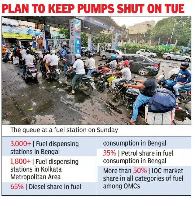 KOLKATA: Petrol pumps across the city saw serpentine queues on Sunday with a fuel crisis apparently looming large due to a strike called by fuel transporters, which was later called off. Most petrol stations may still go dry on Tuesday since petroleum dealers are yet to withdraw their ‘no-purchase-no-sale’ agitation. As a result, 3,000 petrol pumps in the state, including those in Kolkata, may remain shut on August 31.
