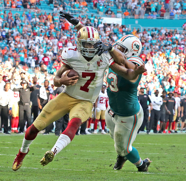 Kaepernick added four rushes for 62 yards including a gain of 30 in the first half; Tannehill had three carries for 24 yards, including a gain of 17.