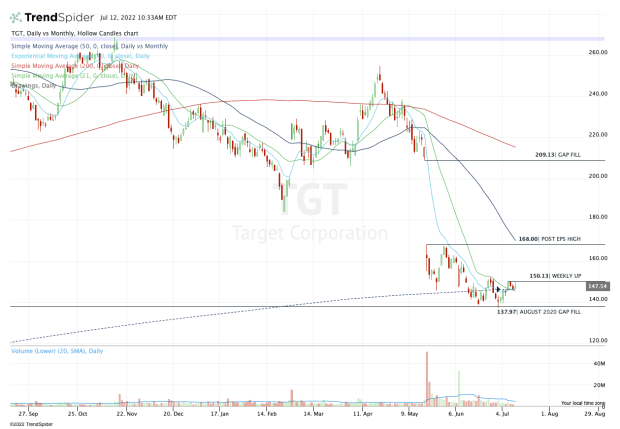 That opens the door back down to the $138 to $140 area, which has been support thus far amid the pullback. Notably, Target stock finally filled the gap from August 2020.