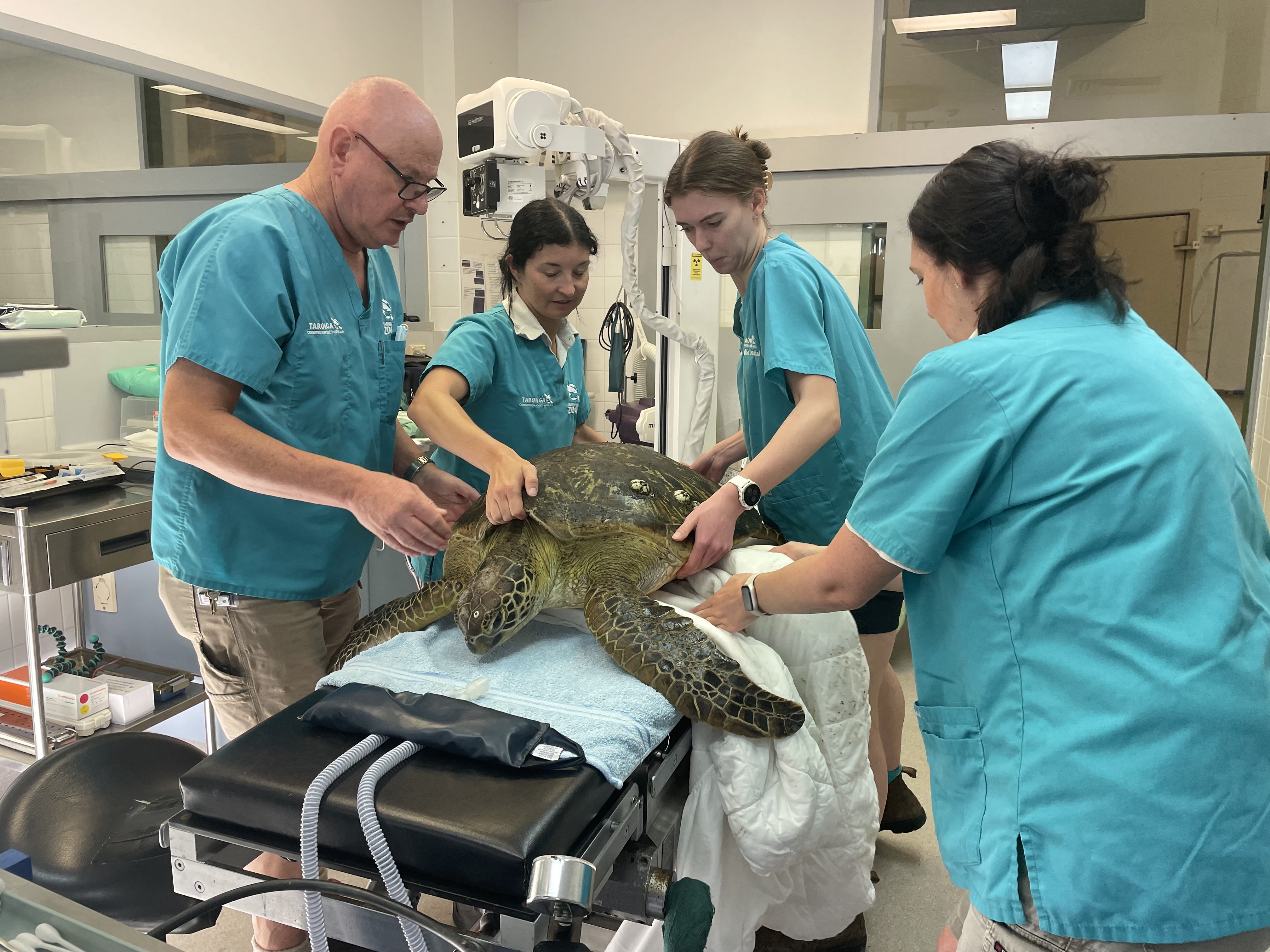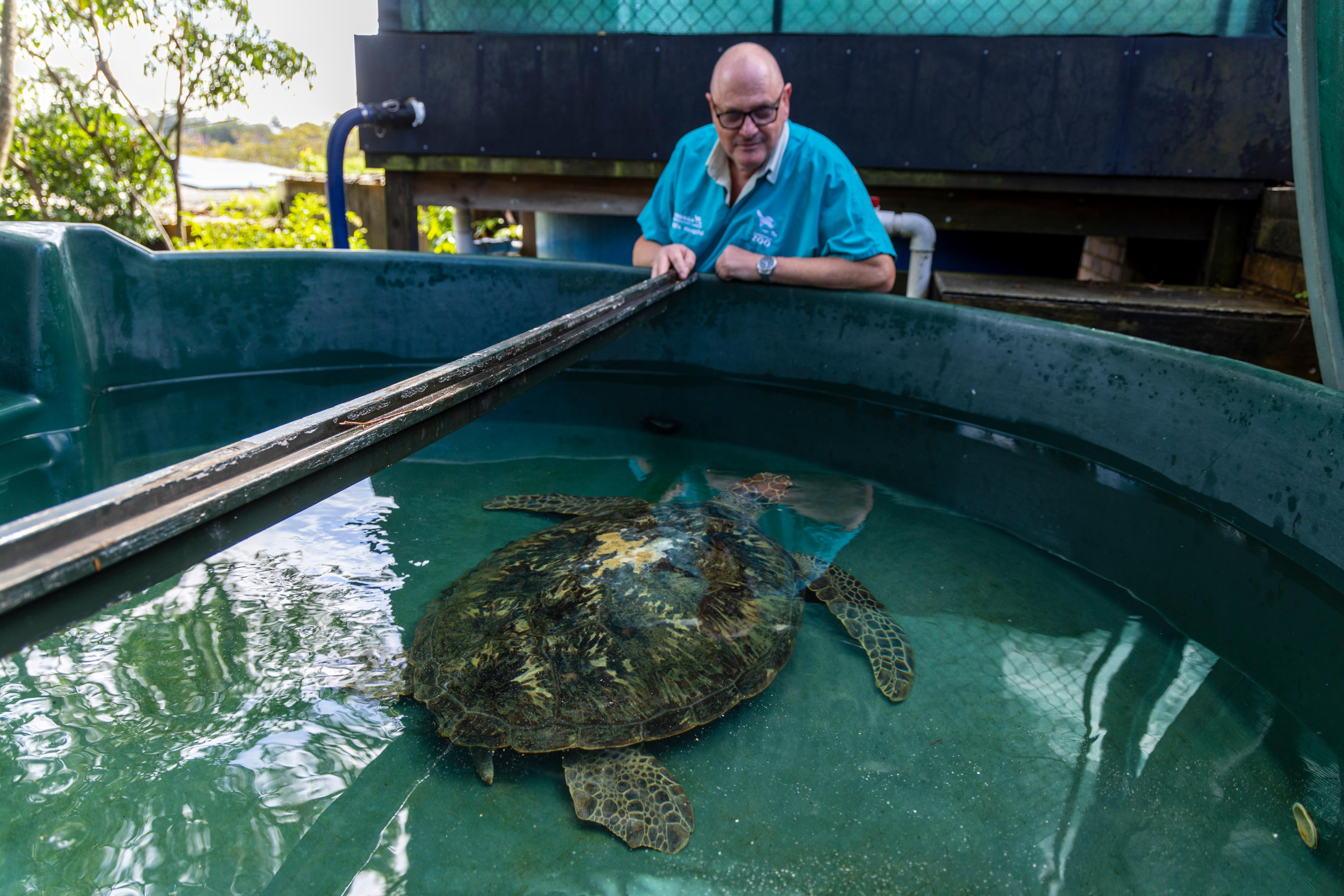 The 50kg green turtle was brought into the Sydney animal hospital from Lake Macquarie by a local who found the animal weak and floating in the water.