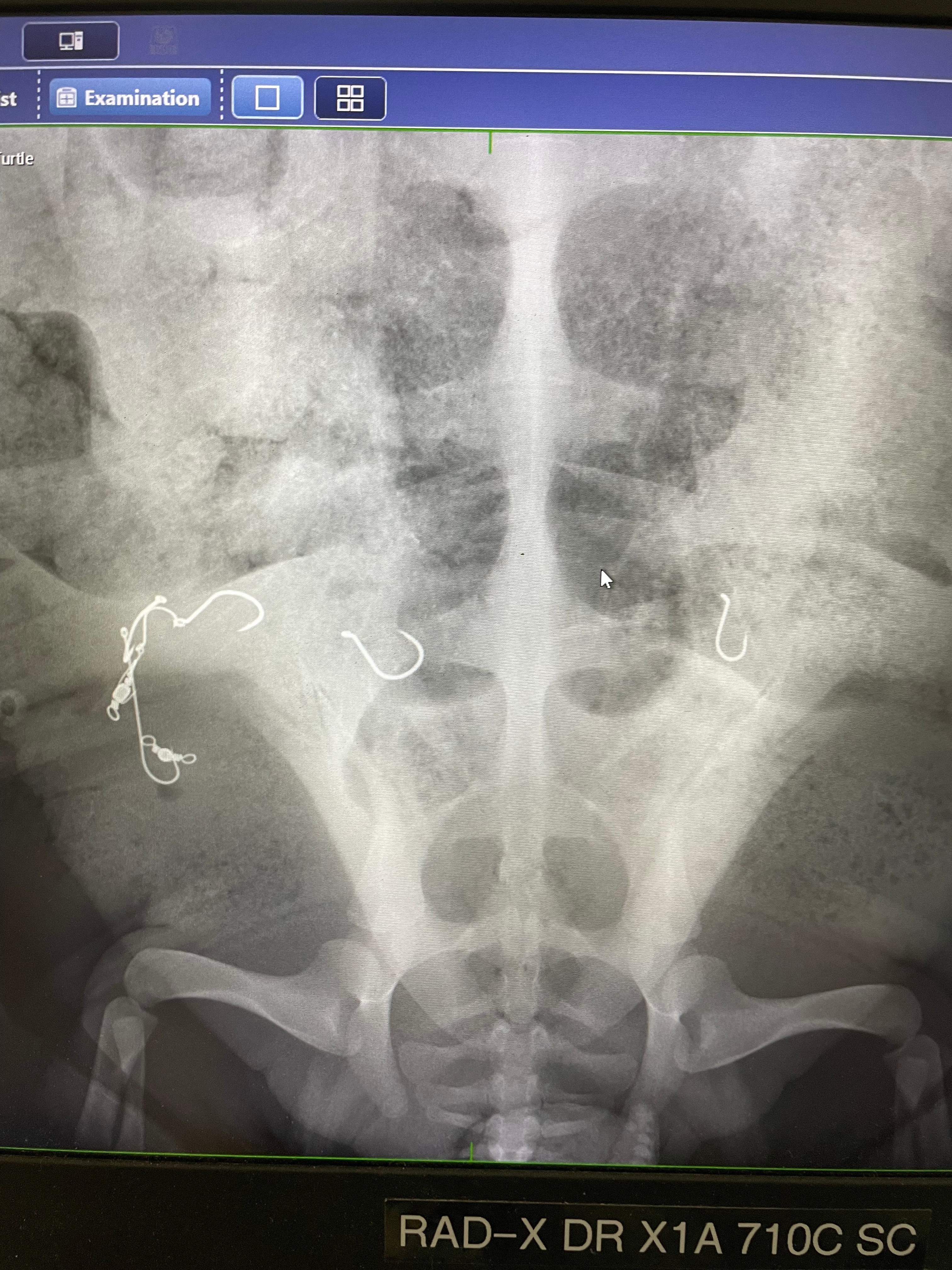 X-rays revealed seven hooks inside the turtle, including four that were in a gang-hook formation.