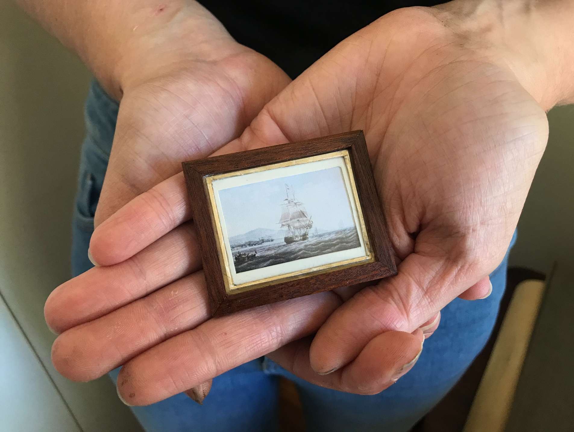)"In the dining room, I've got on the mantelpiece a little print of the convict ship that my ancestor came out on, it's been made to look very grand, but in reality, it's a convict ship."