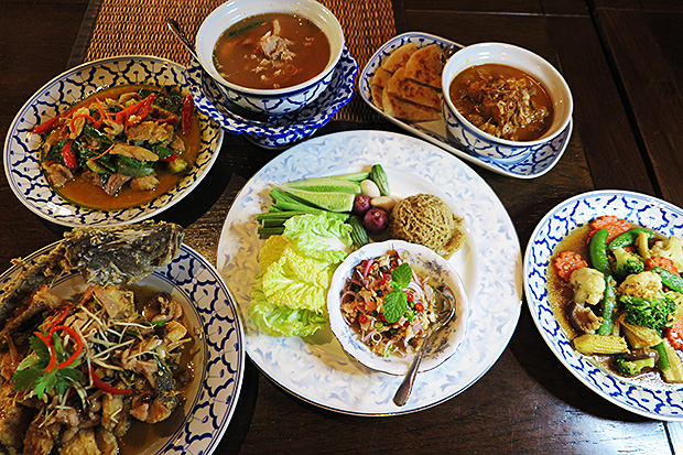 The also excellent steamed sea bass with sweet tamarind sauce, ginger and mushroom became a classic in Rama V's reign, as did the sour, sweet and rich stir-fried pork tenderloin with yellow chilli paste and bai sieow leaf. Even the dish of wok-fried mixed vegetables with oyster sauce is exceptionally well-cooked, crisp and tasty. All go exceedingly well with perfectly cooked jasmine rice.