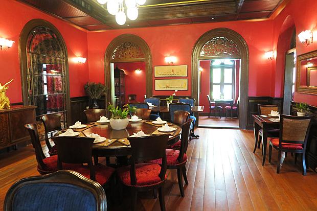 With its plum red walls, lustrous wooden floor, timber beamed ceiling, carved door arches, scarlet and azure velvet upholstered dining chairs, antique cabinets and art, and chandelier-centred lighting, the main dining room spills into more intimate alcove areas.
