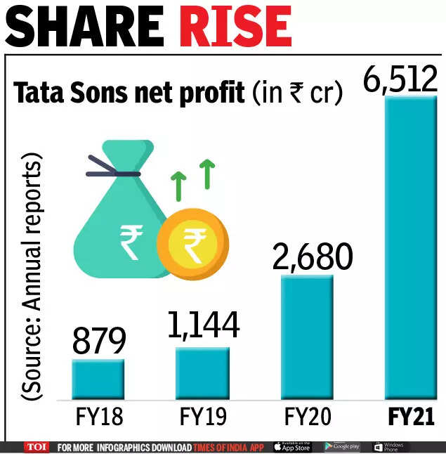 MUMBAI: Tata Sons profit more than doubled in fiscal 2021 on the back of gains made from participating in the share buyback programme of TCS. Profit zoomed 142% to Rs 6,512 crore from Rs 2,680 crore in FY20.