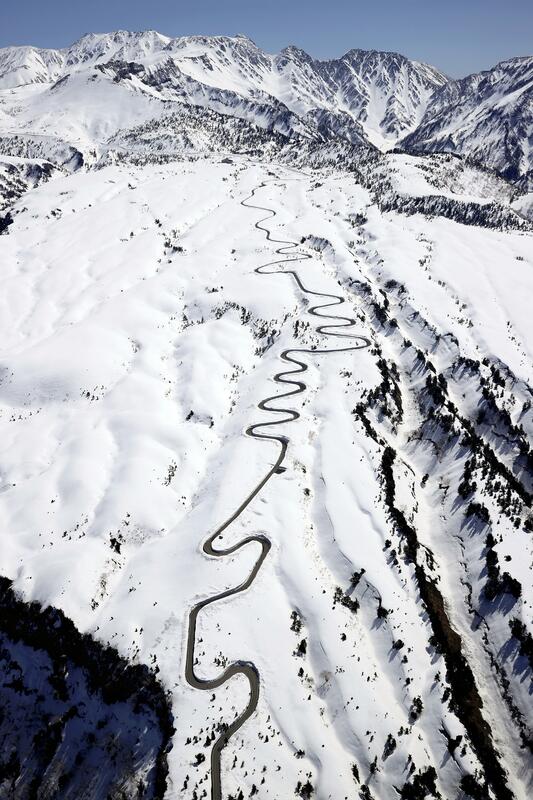 The route is seen from Yomiuri Shimbun aircraft on snow-covered slopes on Wednesday. The whole of the route will reopen on April 15.