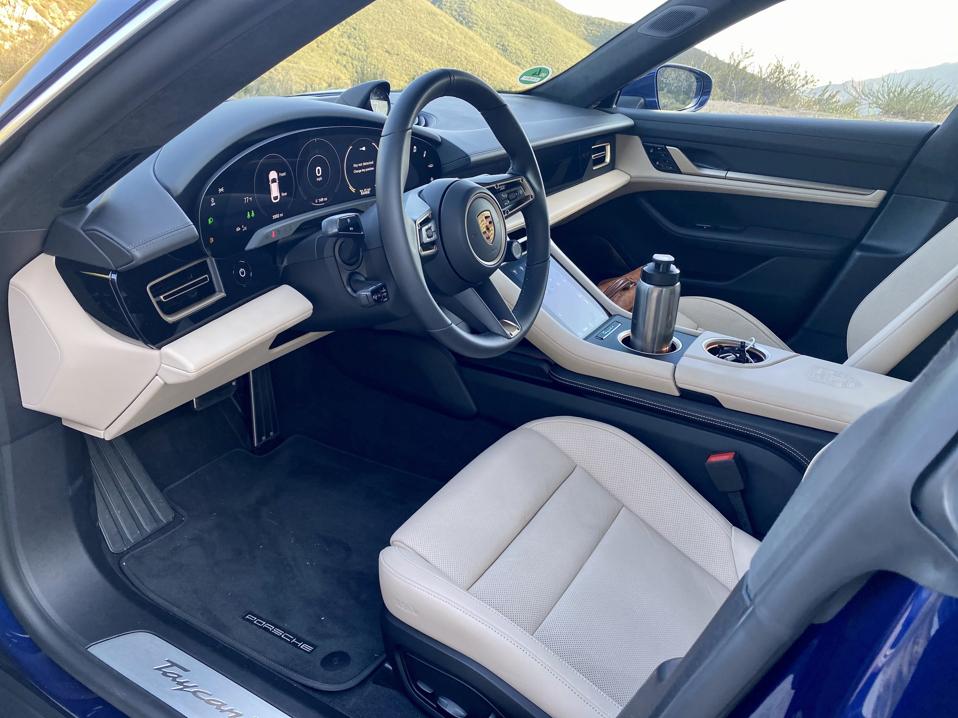 Because the electric power is quite literally seamless—how many times was I directed to use the word “seamless” writing performance-car brochure copy years ago?—Taycan connects the driver to the sensation of speed in new ways. Only under all-out acceleration is the entire well of electric torque used up. You steer, brake and apply the throttle, but beyond human reaction times, there’s little hard work to access all but the furthest reaches of the performance envelope. Even with no-lag turbos that have wide, flat and tall 100-percent torque “curves” stretching over several thousand revs, gas engines still have power curves that rise and fall with revs. Miss a downshift or two and a turbo gasoline car can be caught flat-footed. Even the finest dual-clutch gearbox cannot match the unbroken flow of instant torque from two big electric motors, a unique trait of a high-performance BEV.
