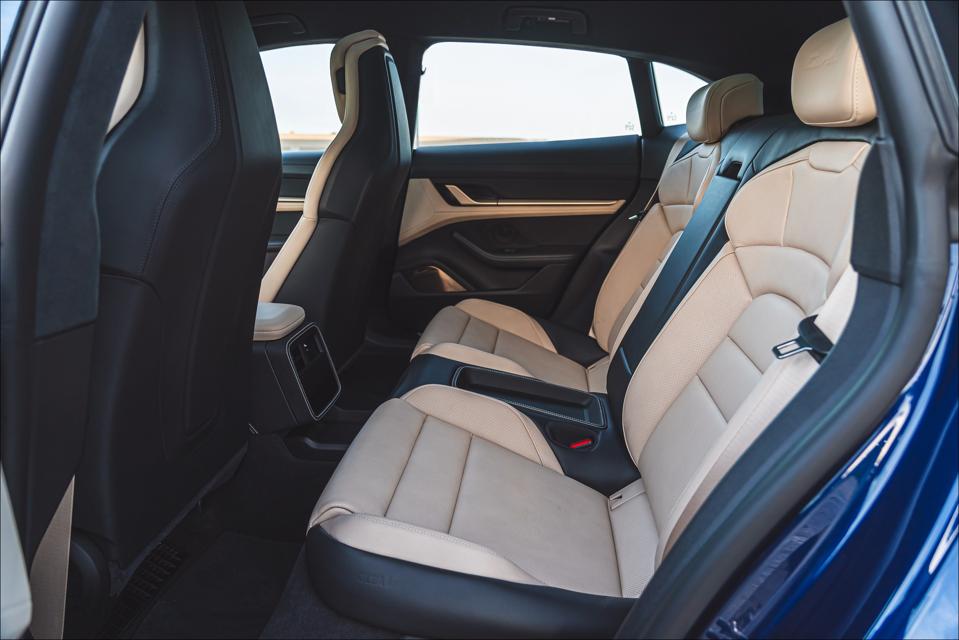 Taycan Turbo Turismo can hit 60 in just over 3 seconds and will likely cover a quarter mile in the high 10-second or low 11-second range, the heart of Supercar Country. Acceleration for classic highway passing, from 50 to 75 or 80, is stunning. Dawdling cars are simply dispatched. Of course, pay the extra bounty to move up to the top-spec Turbo S and hypercar owners live in fear of a head-to-head street-racing sprint, with times in the mid 2-second range. One wonders if there will ever be a Taycan RSR, stripped of luxury, a state-of-the-art BEV track car.