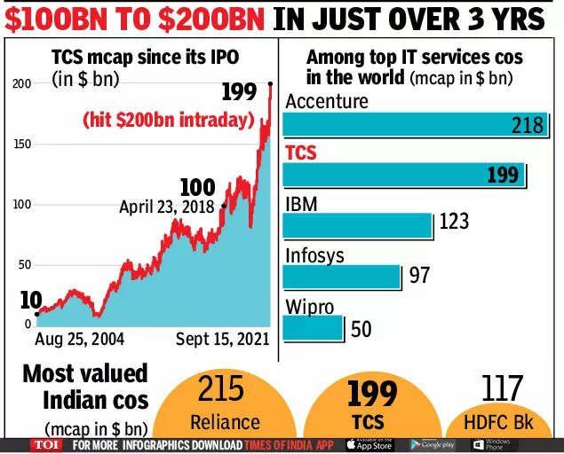 In Wednesday’s market, TCS crossed the mark in mid-session and closed just a tad off with a market value of $199.1 billion, official data showed. When TCS was listed in August 2004, it had an mcap of about $10 billion.