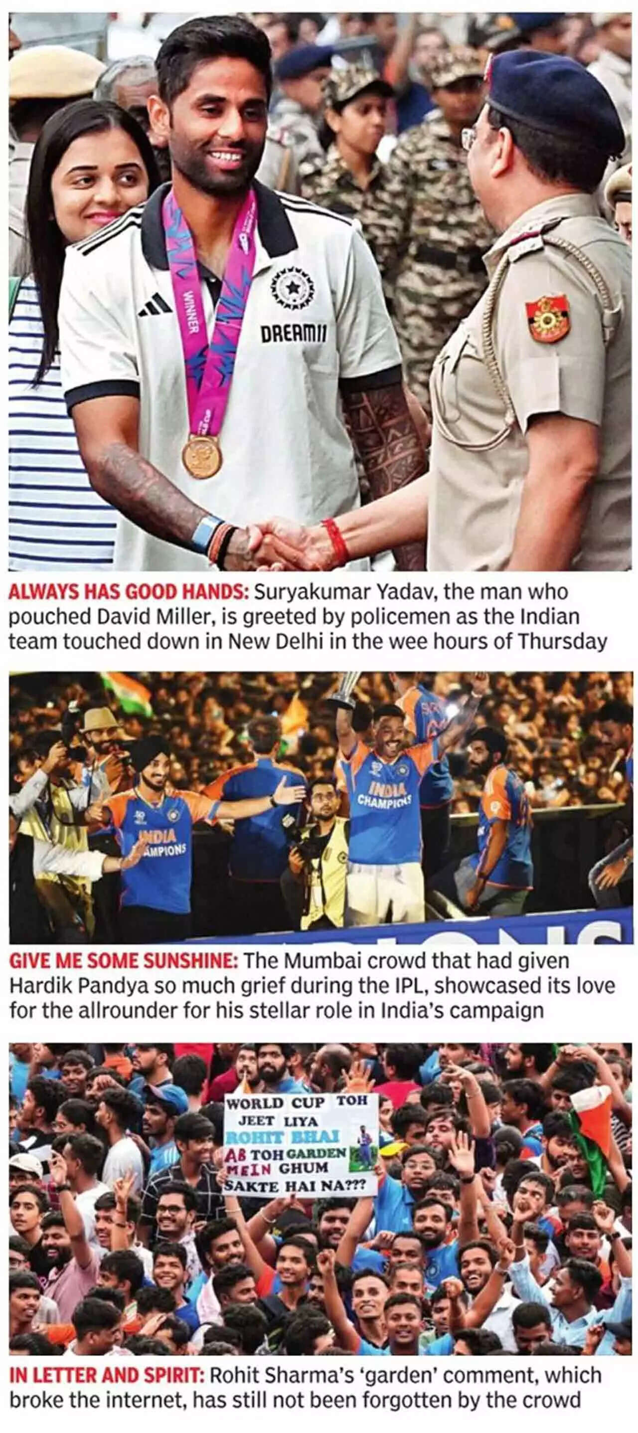 The cheers were loudest for Rohit's captaincy, Kohli's tenacity, Bumrah's accuracy, Surya's that catch and Pandya's allround performance. Once the speeches and the handing of Rs125cr cheque was done, the team went on a victory lap.