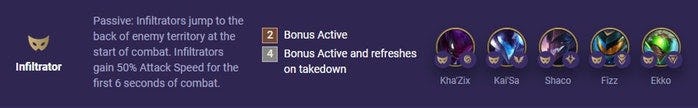 We’re starting with an Infiltrator and Brawler wombo combo that is centered around getting 4 Infiltrators to hit your opponents’ backline as your 4 Brawlers tank the enemy team’s damage. You’ll also want at least 2 Valkyries on the board to gain that Origin bonus, which shouldn’t be an issue since Kai’Sa is a 2-Cost Infiltrator-Valkyrie unit that you’ll definitely want to pick up.