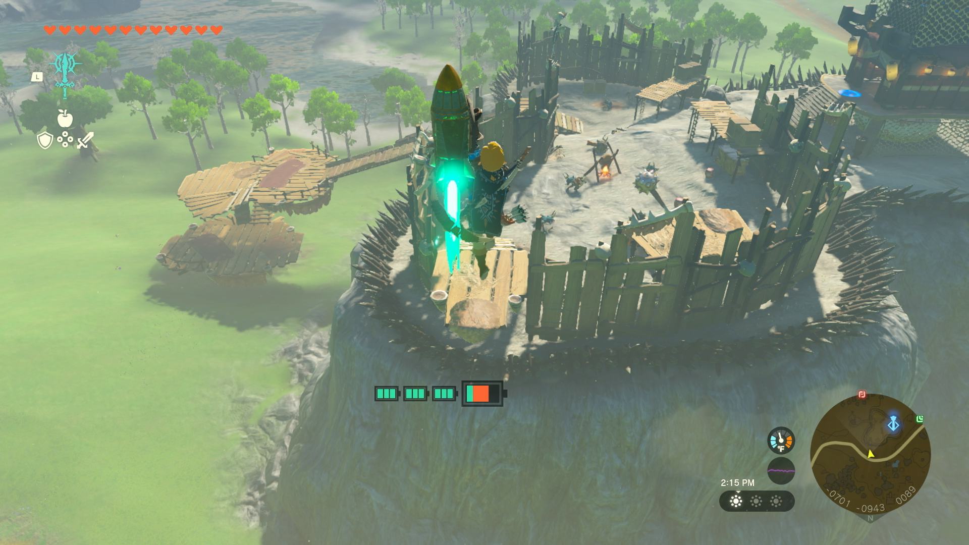 I did explore this area in my demo, and mounted two rockets horizontally on the sides instead, because it didn’t seem particularly safe for my Hylian hero to be right next to the flame-belching business end of a rocket. I am now extremely curious if I could stealthily attach one to a snoozing enemy.