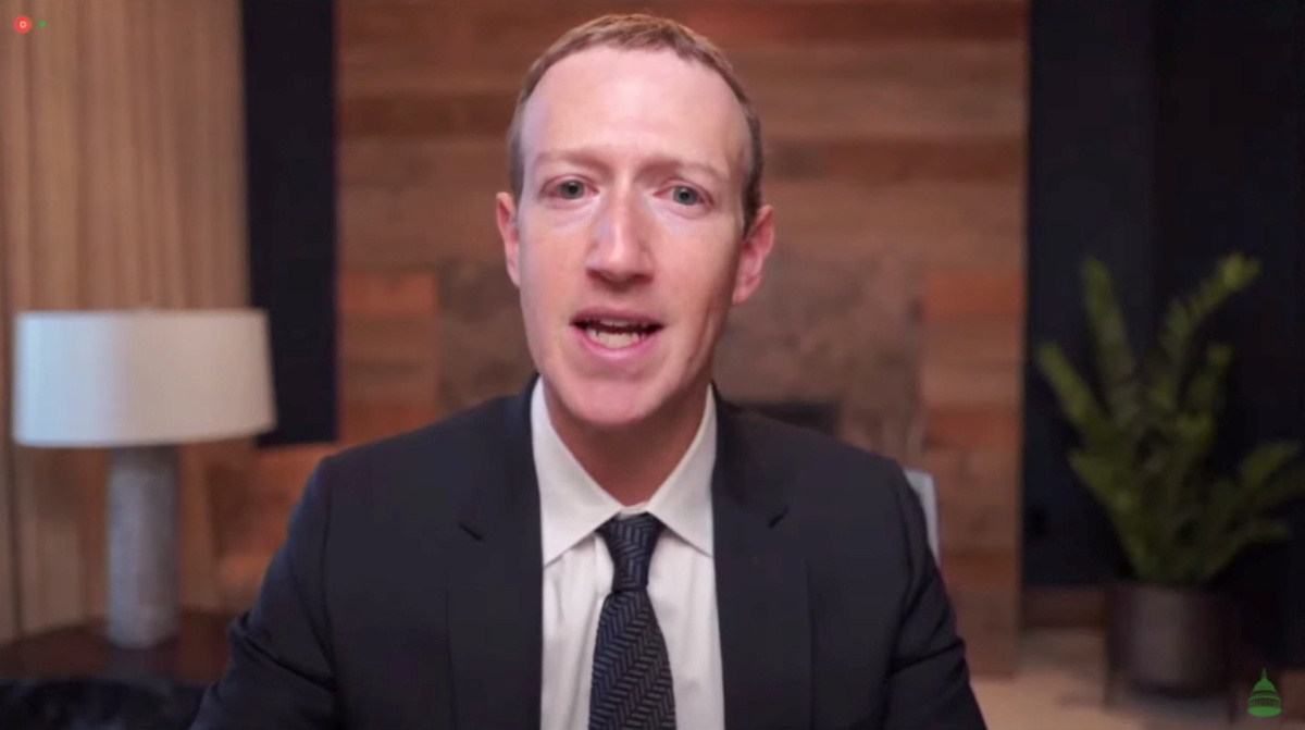 The hearing was virtual but advocacy group SumOfUs erected cut-outs of the three CEOs dressed as Jan. 6 rioters on the National Mall near the Capitol. One showed Zuckerberg as the "QAnon Shaman," a shirtless rioter wearing horns.